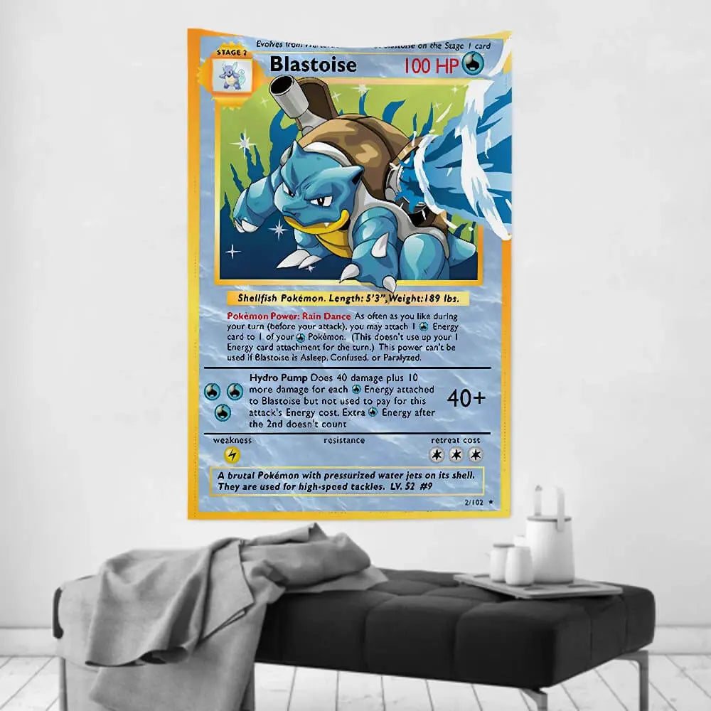 Featuring an amazing design created with advanced HD printing techniques, the Blastoise Wall Hanging - Pokemon Card Tapestry boasts strong layering and a unique, colorful style that is sure to beautify your home. More than just a tapestry, it is a gorgeous work of art with sharp definition and vivid hues that provide visual enjoyment and make a bold statement.