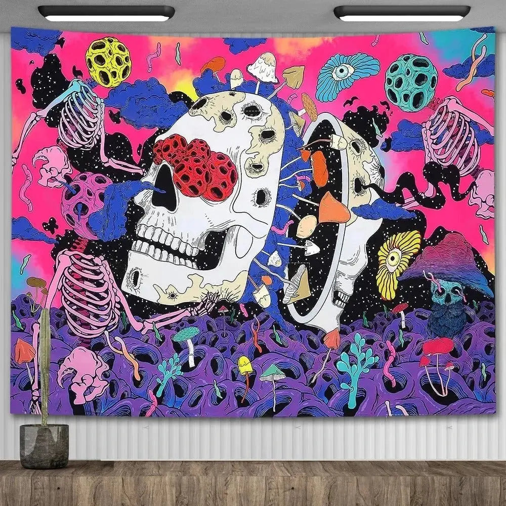 Skull Floral Mushroom Wall Cloth – Gothic Skeleton Aesthetic Tapestry